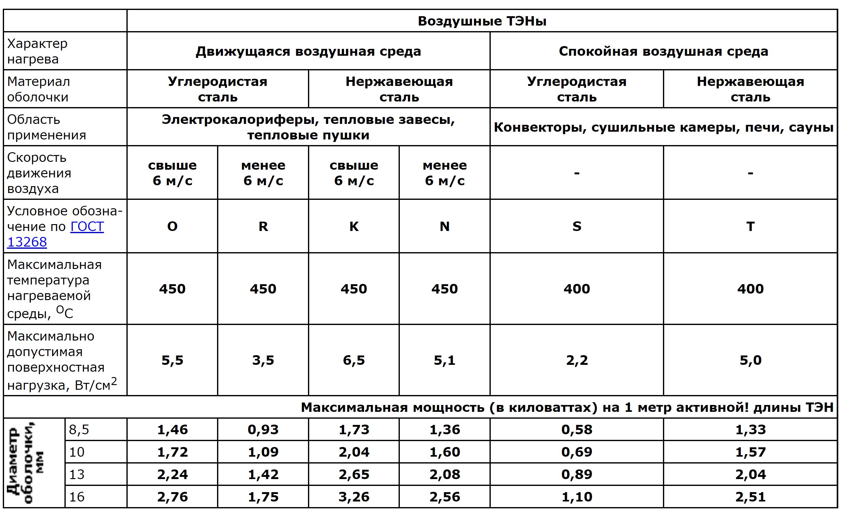 Основным правилом при выборе ТЭН для заданной нагреваемой среды является правильное сочетание геометрических и электротехнических параметров. Ресурс и надежность работы ТЭН зависят от того, насколько велика поверхностная нагрузка. Для различных нагреваемых сред допустимая удельная поверхностная нагрузка разная и является строго нормативной величиной, превышение которой ведет к преждевременному выходу ТЭН из строя.