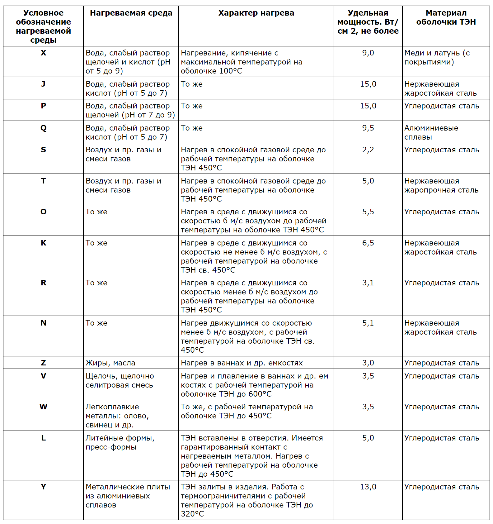 1.Характерные случаи применения ТЭН и удельные поверхностные мощности в зависимости от условий эксплуатации и материал оболочки приведены в таблице: