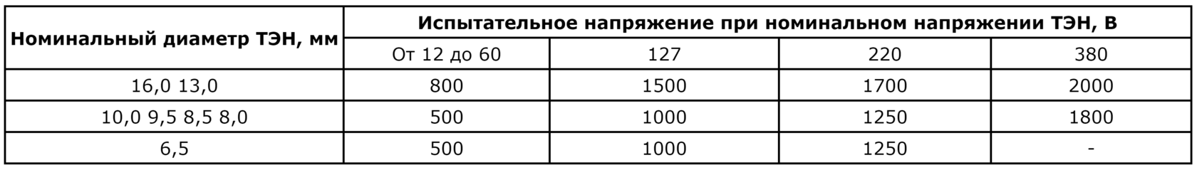 3.11. Изоляция ТЭН в холодном состоянии должна выдерживать испытательное синусоидальное напряжение частотой 50 Гц, указанное в таблице.
