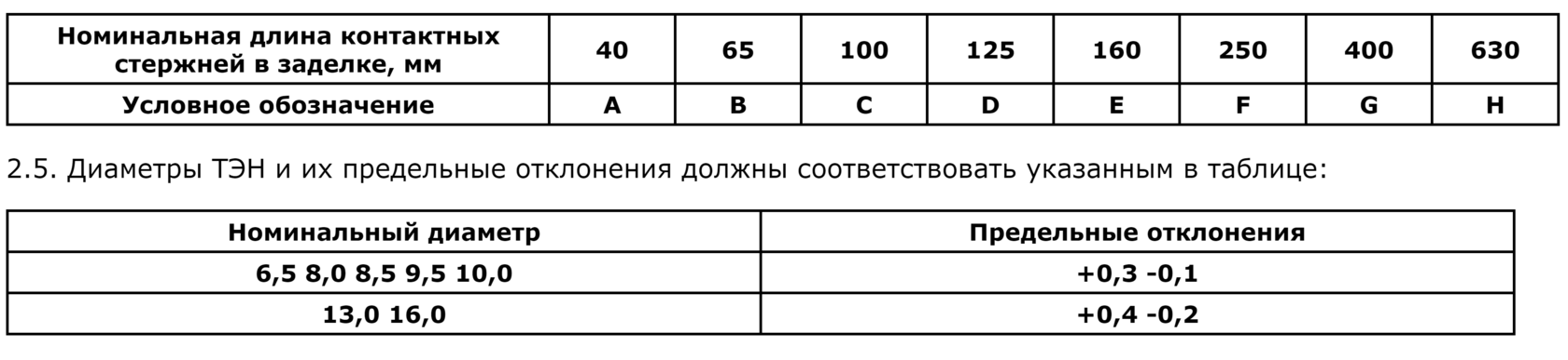 2.1. ТЭНы должны изготавливаться на следующие номинальные напряжения 12; 24; 36; 42; 48; 60; 127; 220; 380 В. Допускается изготовление ТЭН, предназначенных для последовательного соединения, на напряжения ?, 1/3, ? от указанных номинальных значений напряжений. По согласованию между изготовителем и потребителем допускается изготавливать ТЭН на другие номинальные напряжения.