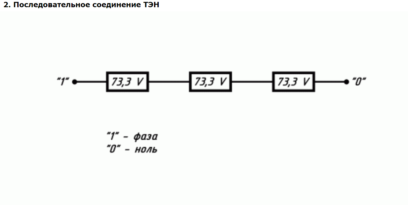• Если последовательно установлены ТЭНы одинакового сопротивления, то напряжение на каждом ТЭНе равно общему напряжению сети деленному на количество ТЭНов в сборке. Другими словами: Uобщ=U1+U2+U3