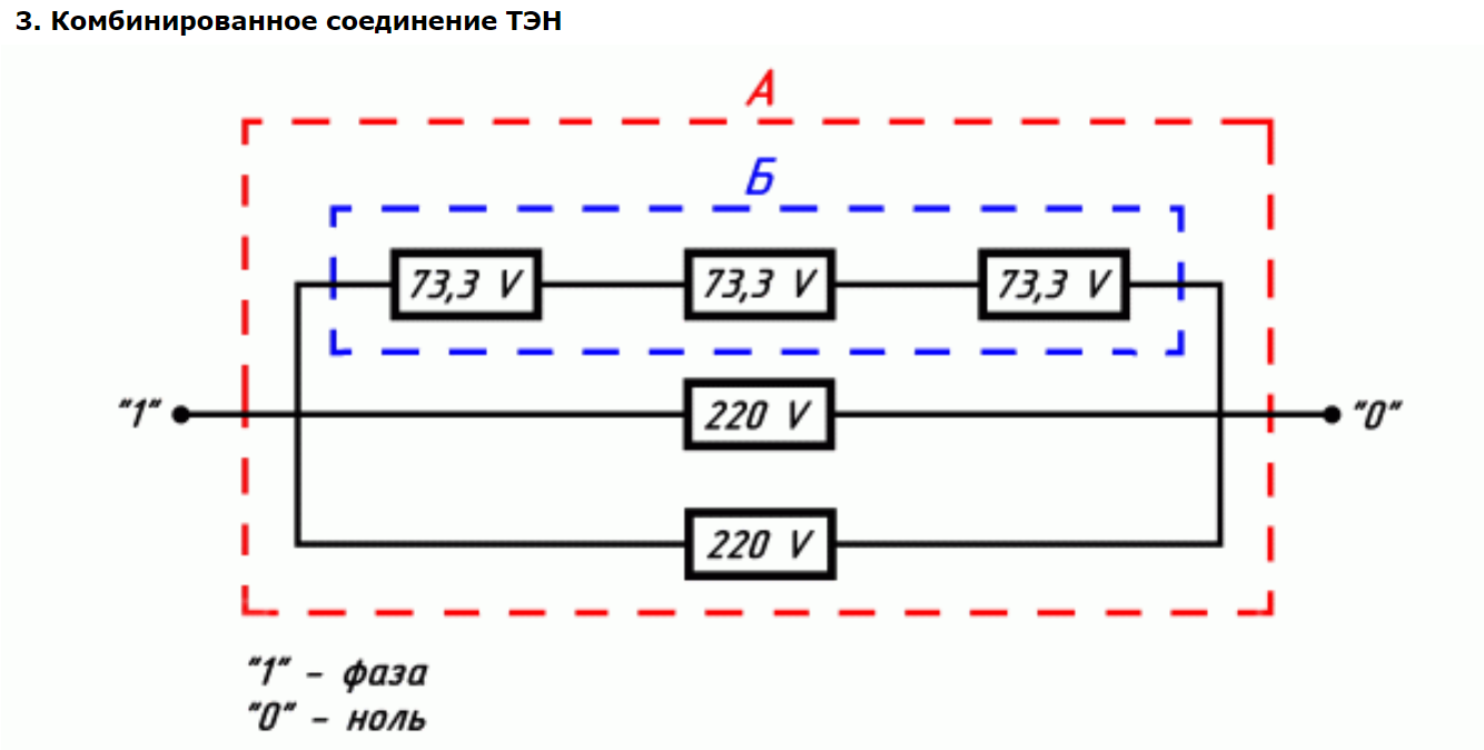 При комбинированном соединении ТЭН, следует разбивать цепь на несколько участков (А и Б), для которых соответственно будут действовать законы либо параллельного (А), либо последовательного (Б) соединения.