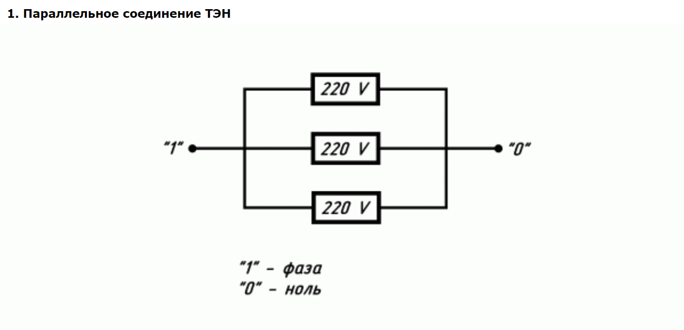 При подключении к однофазной сети (1 «фаза» и «ноль») более чем одного ТЭНа используется параллельная, последовательная либо комбинированная схемы подключения.