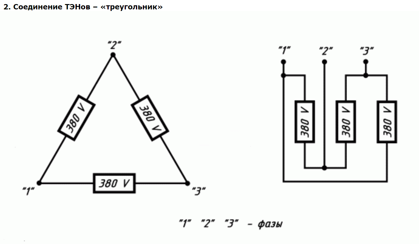 Основные законы, которые действуют при соединении ТЭНов «треугольником»: