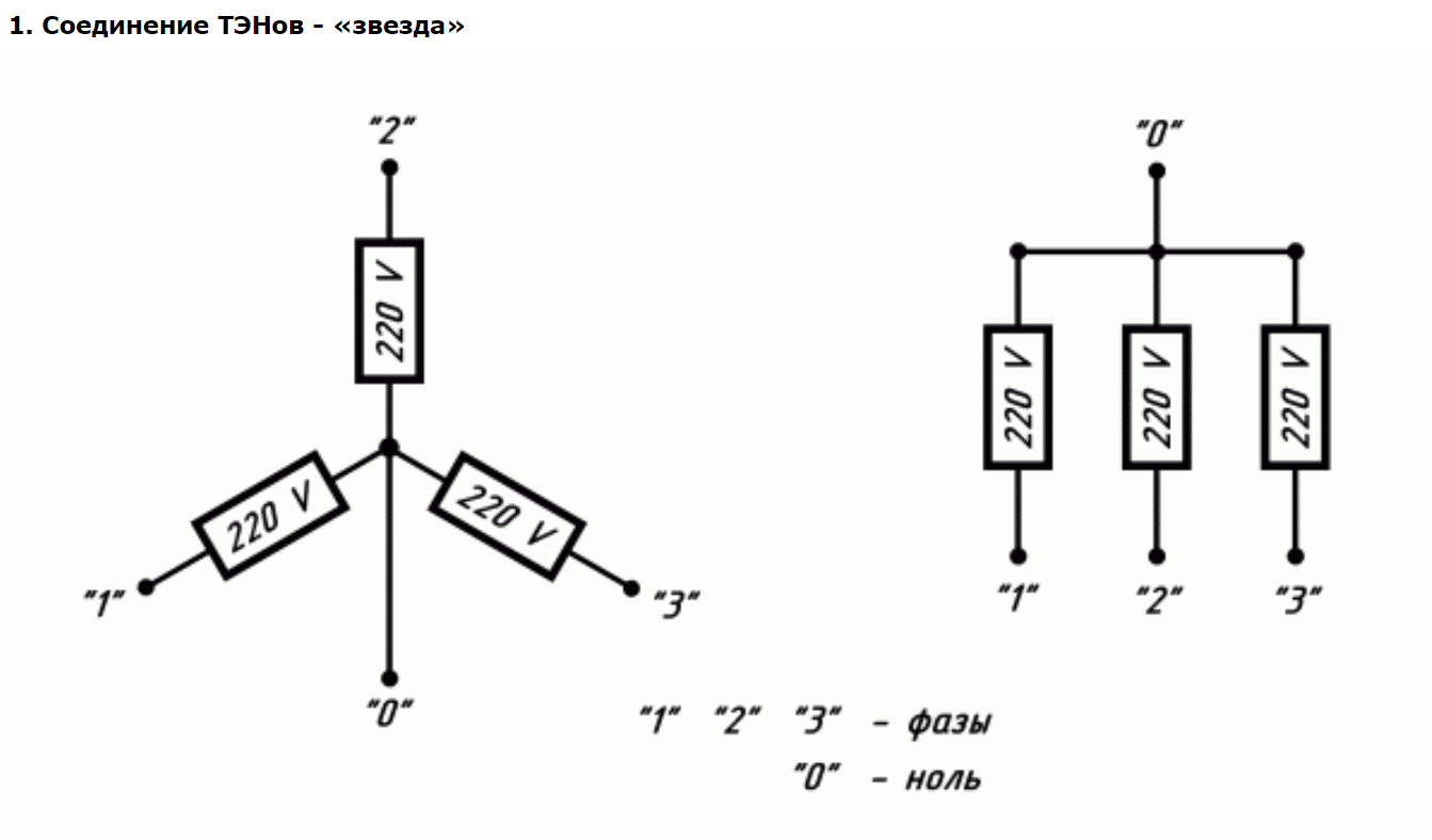 Основные законы, которые действуют при соединении ТЭНов «звездой»: